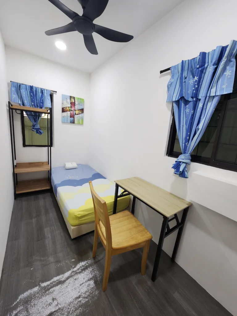 Single Bed + Single Mattress, Open-concept Wardrobe, Study table, Chair & Ceiling Fan is ready in the room!